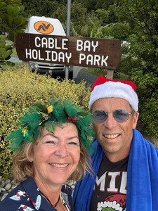 I was rather proud of our Christmas lunch - I am not sure I've ever catered for so few over Christmas, and certainly never in a caravan - but we rustled up a very festive menu. Louis cooked the stuffed chook in the Weber in our fab Weber pan (already proved worth it's rather large price tag!) and I had a ham and some roastie potatoes going in the oven. We had pre-made much of the salads and just had to throw them together with scrummy dressings - I found the recipes for these in an Australian Women's Weekly "Easy Christmas Recipes" book in an op shop in Mt Maunganui and we had challenged ourselves to cater Christmas from this booklet!