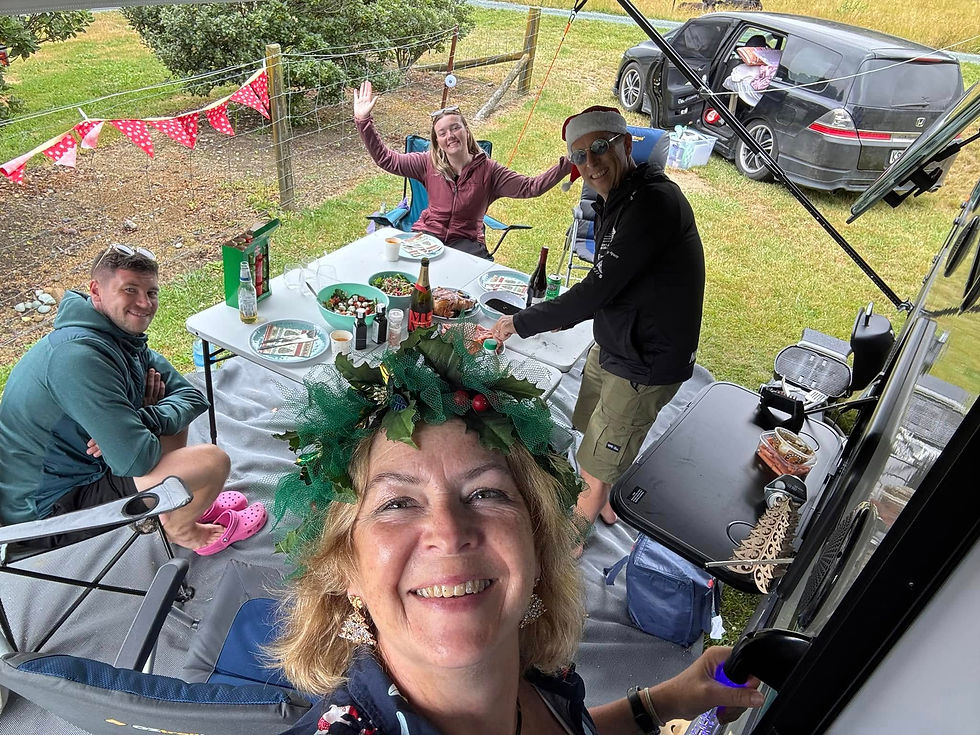 A quick visit to the kitchens to wash up and admire the other campers' Christmas outfits, then we set to work cooking lunch and setting the Christmas table under the awning. Just as Ellen & Ciarán were about to arrive the Heavens opened but not for too long, thankfully.