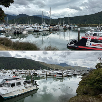 The drive to Blenheim retraced much of the route from the Sounds that we took almost a week previously. Still pretty damp and lots of low cloud. Stopped in Havelock for a cheeky leftovers lunch in Banjo down at the marina.