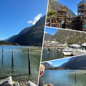 We made it back to the dock ok and reports confirmed no major damage from the quake despite the emergency alert which we all received on our phones just after 3.30pm. It all seemed very relaxed so we followed suit, taking a detour back to the car park to view Mitre Peak in all its majesty, then heading out to Deep Water Basin to see all the cray fishing boats and various buildings which Liz' husband Brendan had constructed there.