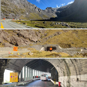 We halted in the queue for the Homer Tunnel - a one way tunnel working on traffic lights, drilling 1.2km through the mountains, work started on this in 1935 (paused during the war) and was completed in 1953. The tunnel is cut into the granite of the Darran Mountains and has no lining, you look up at the sheer mountain rock above and around you as you drive through!