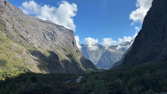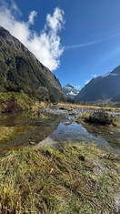 By this point we were heading up into the steeper glacial hills and valleys of Milford, away from the wide open riverbed valleys. The scenery was often jaw dropping. We made the obligatory stop at Monkey Creek (along with several busloads of tourists) with its amazing vista into Fiordland, but sadly not a kea in sight (despite all the warning signs not to feed them).