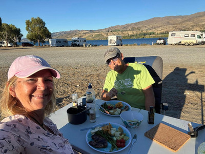 Much busier than the farm but a lovely scenic spot on the shore of Lake Dunstan to call home for two nights. BBQ lamb steaks for dinner accompanied by a bizarrely variegated orange & white kumara.