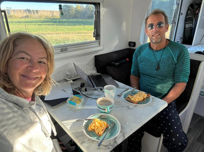 More creamy eggs - none from Robbie Hewitt this time so they looked a little less golden - for breakfast then we packed up carefully & thoroughly, double checking that all the lids in the fridge were securely screwed or clicked into place to avoid a repeat of the previous spillage.