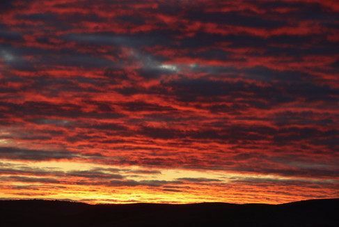 The glow in the sky just before the sun peaked over the hilly horizon was fiery red, turning to vibrant orange & gold - but to the south, the tones were a softer peachy orange over the grey blue sea.