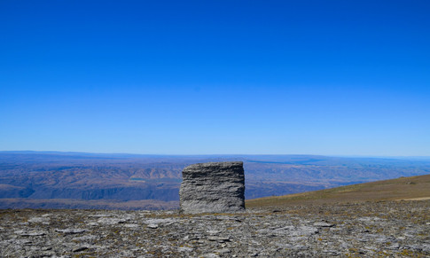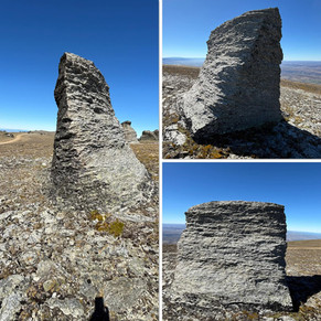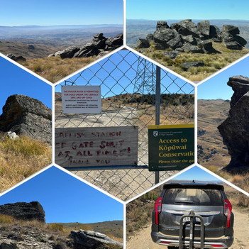 About 15km out along the Clutha we hung a right and climbed up and up and up, over cattle grids, through bent gates, over enormous stones, rocks and ruts, along the Symes Road - over a kilometre upwards to The Obelisk, the Old Man or Kopuwai. At 1682m above sea level and standing 26m tall, there is nothing higher between here and the South Pole.