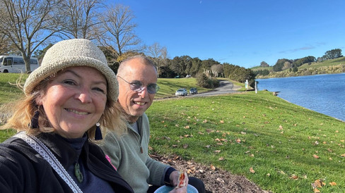 Coffee & date scone stop in Tirau (taken all those corrugated iron sheep photos before so didn’t bother this time - and the gelato shop was closed for winter😲) then pushed on to Lake Karapiro. We had planned to freedom camp here but firstly the space was pretty boggy, and secondly I was unsure about our potential neighbour… the caravan in the photo with all the solar was accompanied by a hairy wizard creature sitting under a blanket draped like a cloak, but it was open in front and from my distance I’m pretty sure he was naked underneath 🫣