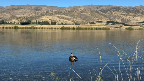 Back at Banjo, Louis struggled into his wetsuit in the heat of the afternoon then I dropped him off 3km up the lake so he could swim back to camp.