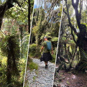 From the dredge we followed the forest track to the lagoon. The whole path comprised layer upon layer of round flat grey stone which was surprisingly pleasing to walk on. Walking through the bush was almost spooky with gnarly wind bent trees and the usual array of hanging lichens and ferns.