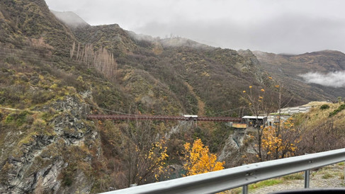 Queenstown was a little clearer with ribbons of clouds striping the hillsides, and by the tine we reached Lake Hayes and then Kawerau Gorge we were getting decent views again and even had a wee stop by the famous AJ Hackett Bungee Jump site to let the faster traffic pass us.