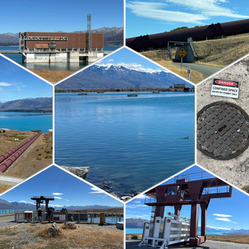 The Tekapo Canal and Pukaki Canal are all part of an elaborate hydro power scheme run by Meridian Energy, and from this holding lake the canal was fed down to a power plant on the side of Lake Pukaki via two enormous tubes which ran above the road we had been travelling on. The huge metal structure at the top of the hill held 3 enormous sluice gates and ran on tram tracks so that they could obviously seal off the water flow if required - fascinating
