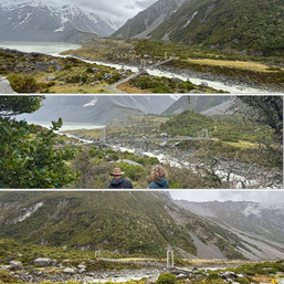 We left the camp in low cloud, drizzle and rain and headed up the Hooker Valley. The path took us over the first bridge and up to the Mueller Glacier Lake look out, by which time the clouds had pulled back a little and we could spy many of the snow-capped peaks around us, and hear the sound of glacial ice cracking and falling, causing avalanches in the distance. The Mueller Glacier Lake is a strangely milky, pasty green colour caused by a high concentration of freshly ground out rock flour from the movement of the glacier higher up the valley - as the concentration diminishes lower down the rivers and lakes, further from the glaciers, this is when the iconic turquoise/aqua waters occur - the sunlight glinting off the glacial flour crystals.
