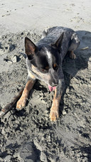 Before dinner we wandered down to the beach which was stunning and wild, dark grey sand & pebbles and strewn with driftwood and a new thick bank of wood that had washed downstream and been deposited back on the sand in the storms. We met a couple who were gathering firewood from the latest deposit of branches and trees, and had a smooch with their Blue Healer, Taz, who was honestly more interested in fetching a stick than any pats or cuddles!