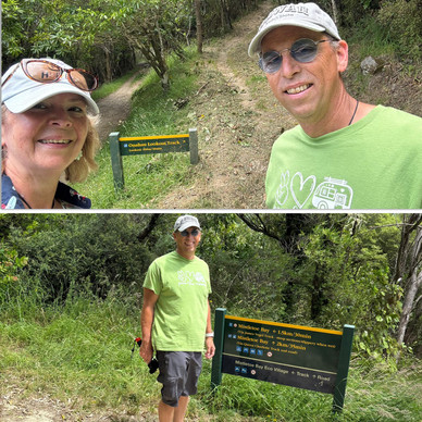 Pointed in the right direction and armed with a map of sorts, we drove up and over the saddle to Mistletoe Bay to pick up a track. Due to a lack of hard information we picked the hardest route/root going pretty much straight upwards over the gnarliest tree root path ever! We started on the James Vogel Circle Track then got distracted by the temptation of the Onahau Lookout Track and detoured onto that.