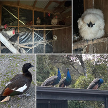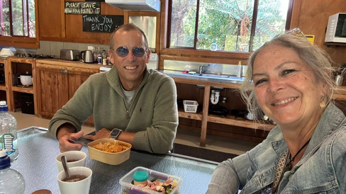 We stayed at Jackson's Retreat in Banjo at the end of January 2024 so it was fun to be back almost a year later to the day, but this time staying in a cabin. Our little room had just a bed, table & chairs with the communal facilities available just a few steps away. Very cosy communal kitchens and living room space and very nice bathrooms for campground. We had dinner then I went to ask if we could buy some fresh eggs. The custodian took me out to the chooks in the hen house to have a look, but they hadn't laid any since this morning. But I did get to meet Duckie, his pet honk-wah duck that he had raised from an egg! Louis and I went for a wander around the grounds as the sun prepared to set, meeting the iron troll at the entrance bridge and the peacocks on top of one of the larger cabins! A lovely break on a cool, mostly clear evening - perfect!